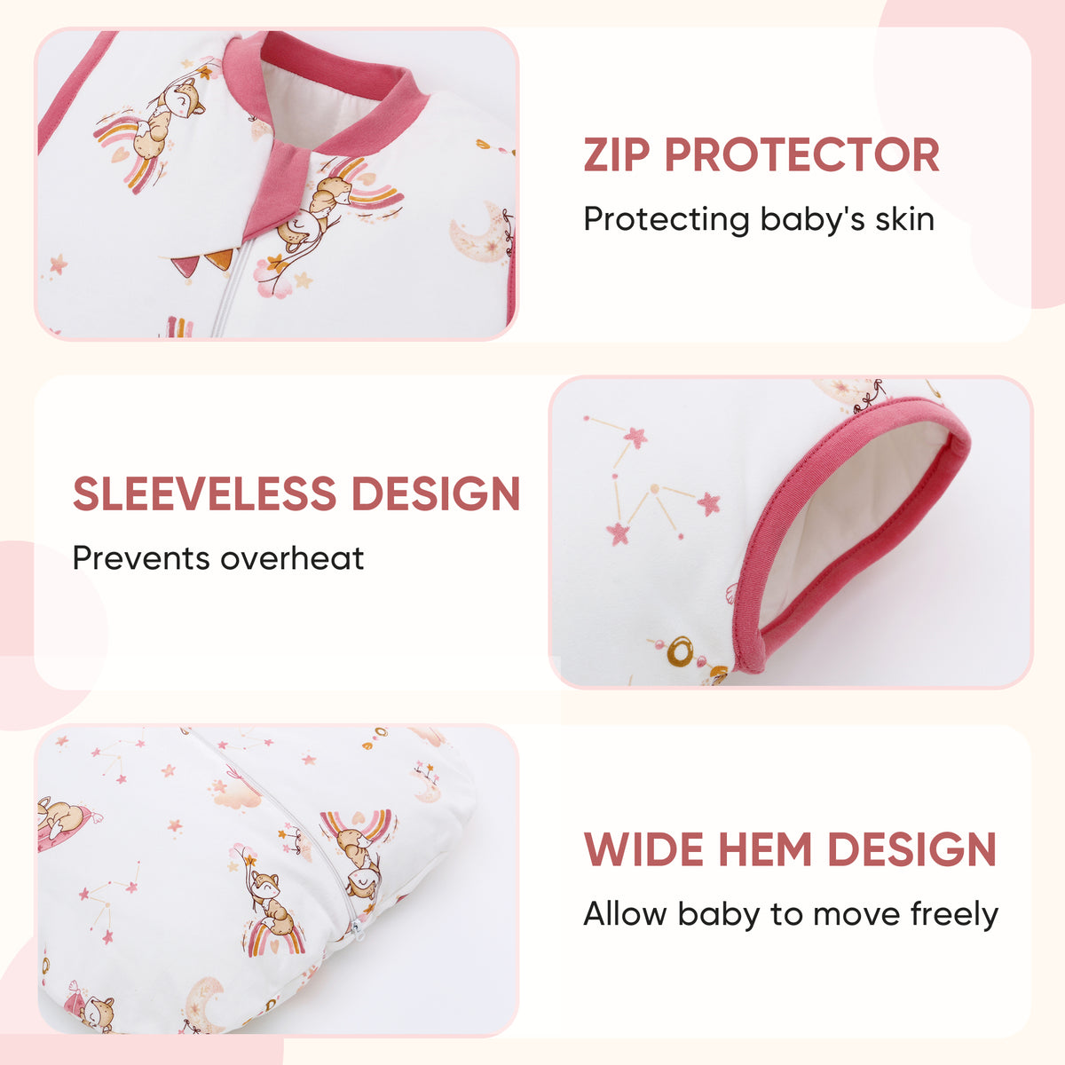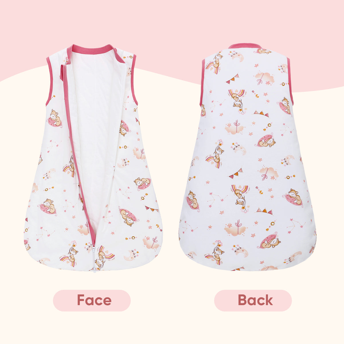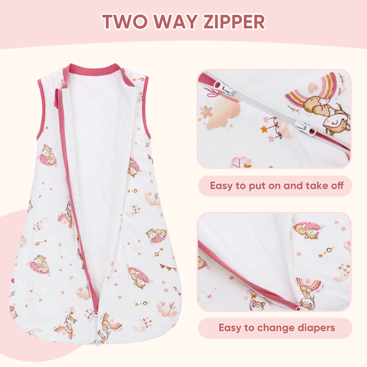 - SMOOTH 2-WAY ZIPPER: Our baby sleep sack features smooth 2-way zipper zipper, making it easy to get your baby in and out of the baby wearable blanket. Zipper protectors on the top will protect baby's crotch from scratches.