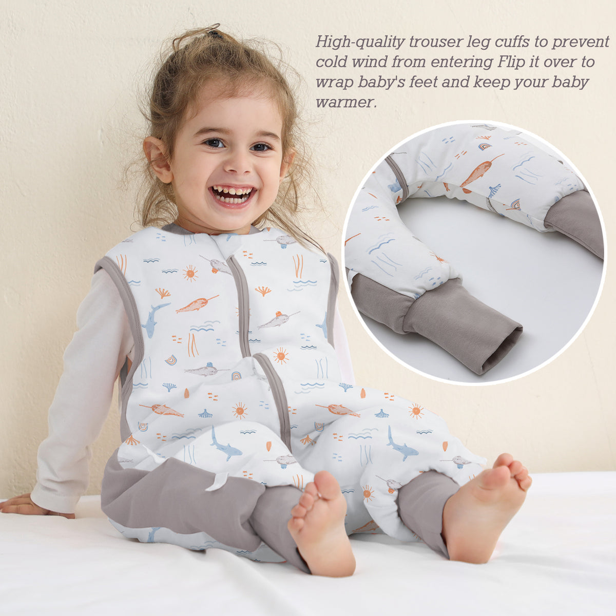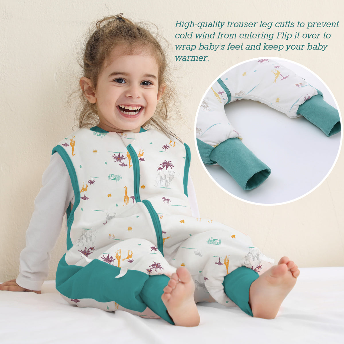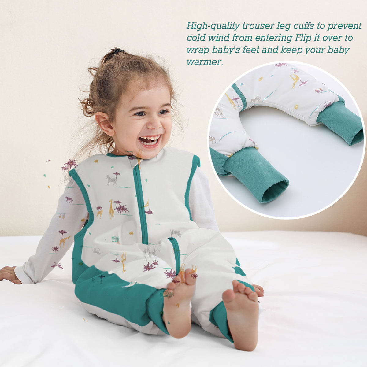 - 【Separate legs & Wrapped foot】 Separate legs facilitate the movements of the baby. Not only Make baby Comfortable and flexible to stand, crawl, walk. but also warms up in the winter night.Loose legs give baby more room to move. Legs with wrapped feet design. The leg pockets can be turned inside out to wrap around the feet for extra warmth.